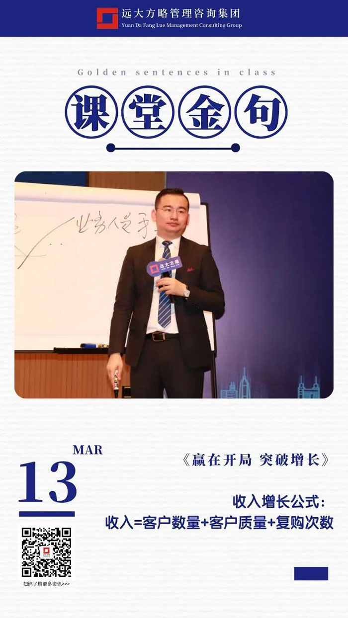 課上老師采用“道、法、術、器”相結合的形式給學員們帶來了一場精彩的知識盛宴。3月13日的課堂上兩位老師也總結了很多金句,可以很好的運用到企業的經營管理中。為了幫助大家更好的吸收和鞏固兩天的學習,小編整理了今天課程雷老師的部分金句分享給大家,希望能給大家帶來更多啟發。