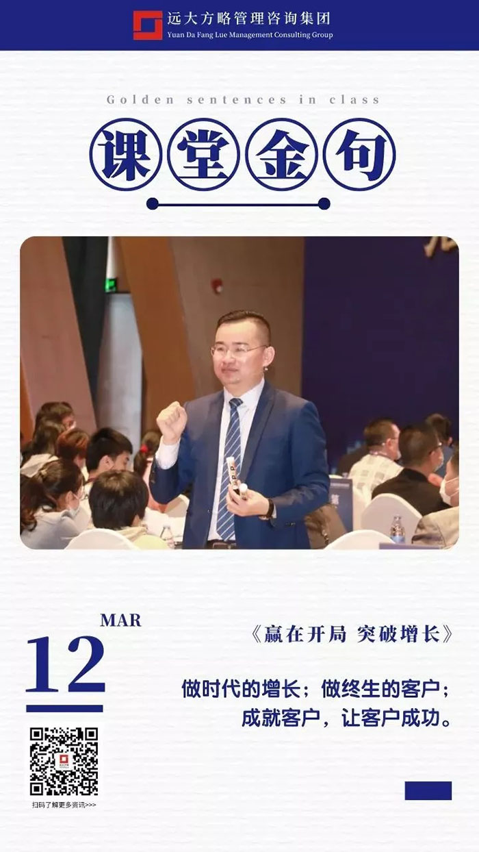 課堂上雷老師講課循序漸進,通過問題的形式逐步引發學員的思考,讓每位學員都能有所感有所悟,回到企業之后能夠落到實處,做到真正的幫企業解決問題,這也正是遠大方略的定位,成為中國實體企業實效的持續增長方案解決商,遠大方略也一直秉承初心努力踐行!