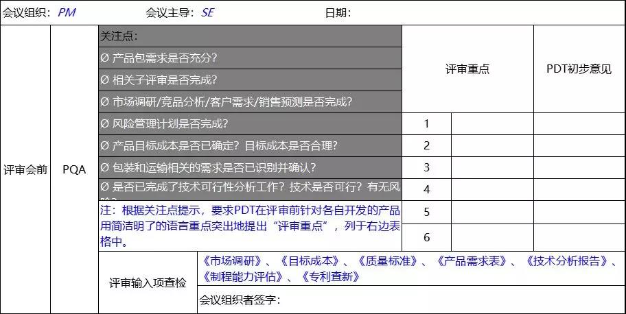 評審過程需要有人負責,一般來講系統(tǒng)工程師是技術(shù)指導(dǎo)者,PQA是過程主持人, PDT核心組成員反映部門問題,代表本領(lǐng)域提出專業(yè)意見,并代表功能部門承擔責任,項目領(lǐng)導(dǎo)以業(yè)務(wù)需要為出發(fā)點對技術(shù)問題做決策。
