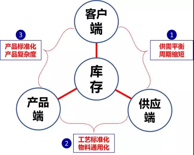 從企業(yè)的運(yùn)營(yíng)角度看,客戶、產(chǎn)品、供應(yīng)決定運(yùn)營(yíng)的復(fù)雜度,直至庫(kù)存的復(fù)雜度。舉例:保證供需平衡、縮短交付周期,可有效的降低安全庫(kù)存持有量;如產(chǎn)品和工藝設(shè)計(jì)通用化及標(biāo)準(zhǔn)后,產(chǎn)品生產(chǎn)難度就會(huì)降低,生產(chǎn)周期就縮短,相應(yīng)的庫(kù)存就下降。