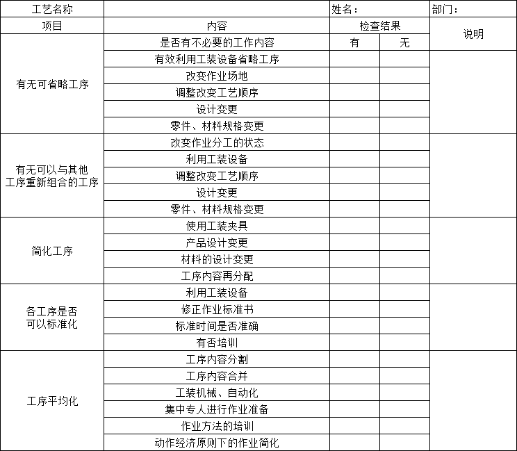 產(chǎn)品工藝分析檢查表將工作中可能涉及的問題進行了匯總,這樣大大簡化了思考過程,使分析過程變得更直觀、更簡便。產(chǎn)品工藝分析的內(nèi)容可以根據(jù)分析者的需要自行設計,如表所示: