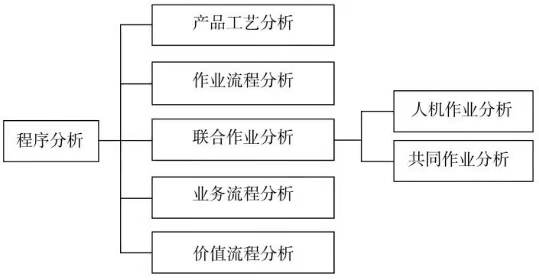 程序分析按分析對象不同,分為以產(chǎn)品工藝為中心的產(chǎn)品工藝分析和以人為中心的作業(yè)流程分析,同時為表達操作者與機械之間的作業(yè)程序或多名操作者之間的作業(yè)程序,又有聯(lián)合作業(yè)分析。其中聯(lián)合作業(yè)分析又因作業(yè)的對象不同分為作業(yè)人員分析法和共同作業(yè)分析法。