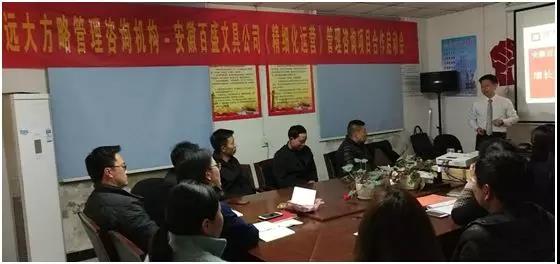 2019年4月,安徽百盛文具有限公司(以下簡稱“百盛文具”)攜手遠大方略遠大方略管理咨詢公司啟動《精細化運營》管理改善項目。遠大方略項目總監程波老師,項目組長唐光輝老師入駐百盛文具。通過與百盛文具公司核心團隊的探討,本次咨詢項目主要圍繞會議模式變革、提升庫存管理水平、組織建設、交付系統、效率提升等內容展開,達到促進團隊成長、降本增效的管理變革目的。