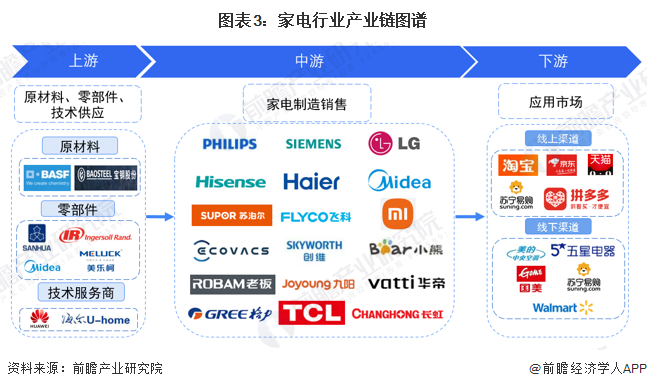 中國家電行業上游主要參與者包括原材料供應商、零部件供應商和技術供應商,原材料供應商代表性企業有鋼鐵企業寶鋼、塑料產品供應商巴斯夫等,零部件供應商有三花智控、美樂柯等,技術供應商包括華為等;中游家電行業代表性企業有美的、格力、海信、海爾、蘇泊爾、創維、科沃斯等;下游銷售渠道主要包括淘寶、京東等電商平臺,也包括蘇寧易購等家電專賣店、美的等品牌的專營店、沃爾瑪等超市渠道。